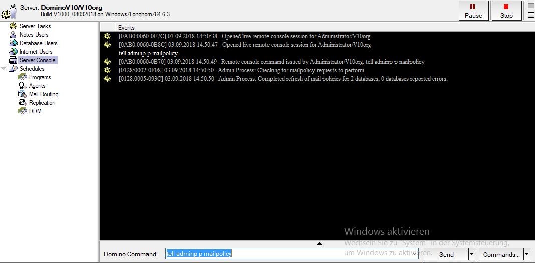 Der Befehl soll die mailpolicy direkt verteilen, was bei mir auch wunderbar geklappt hat. Siehe Domino Console: