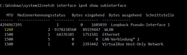 Bsp: netsh interface ipv4 set subinterface WLAN mtu=1280 store=persistent