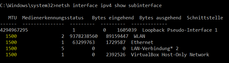 - netsh interface ipv4 show subinterface – zeigt die Einstellungen aller Adapter für IPv4